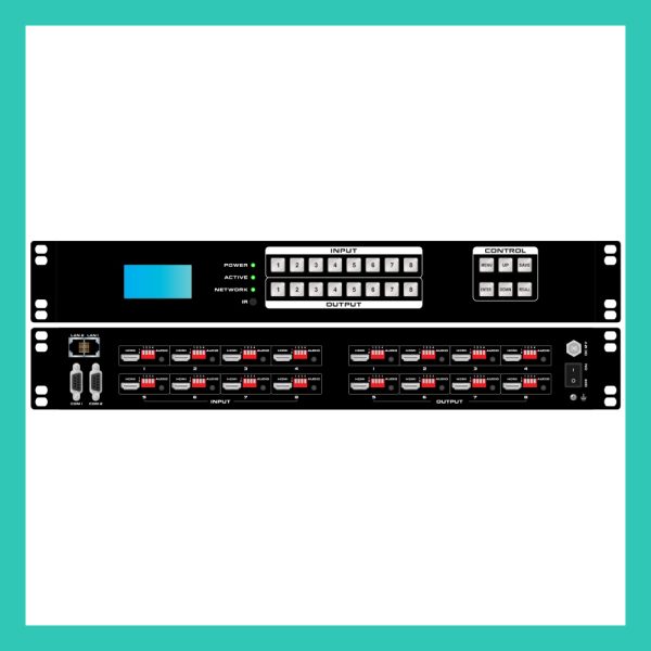 - 8 HDMI inputs with 8 audio in and 8 HDMI outputs with 8 audio outs